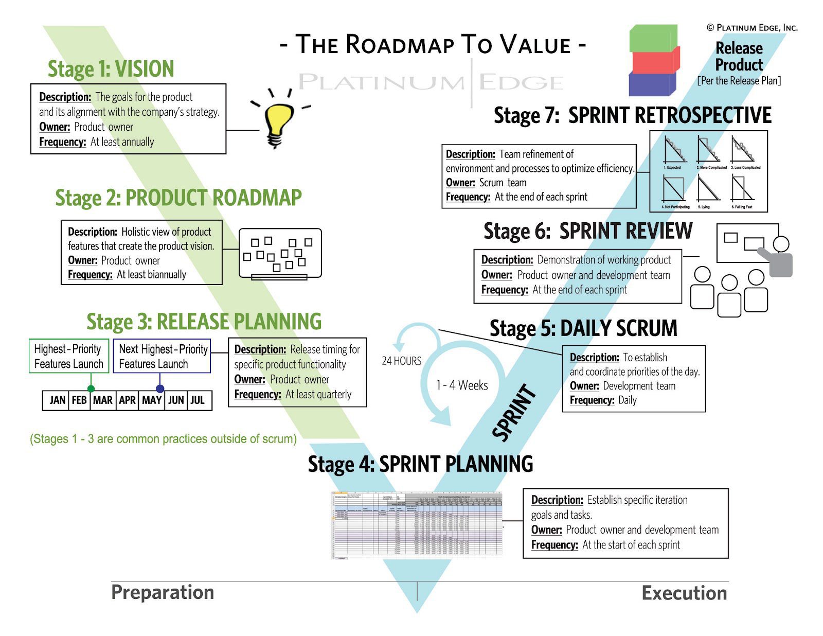 These first two stages are vital to ensure a project under a scrum model is strategically stable. The following stages provide for tactical flexibility to empirically deliver the highest value possible to the customer.