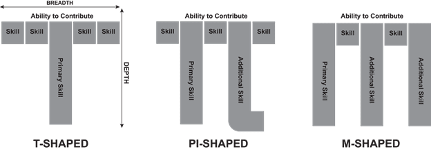 Talent development needs become increasingly important. People with multiple skills become more valuable to the team and organization. Some refer to this as moving from being an I-shaped individual (skilled in one area or discipline such as quality assurance) to becoming T-shaped (a depth of skill in one area, but able to contribute in others), then PI-shaped or even M-shaped (multiple areas of deep skill).
